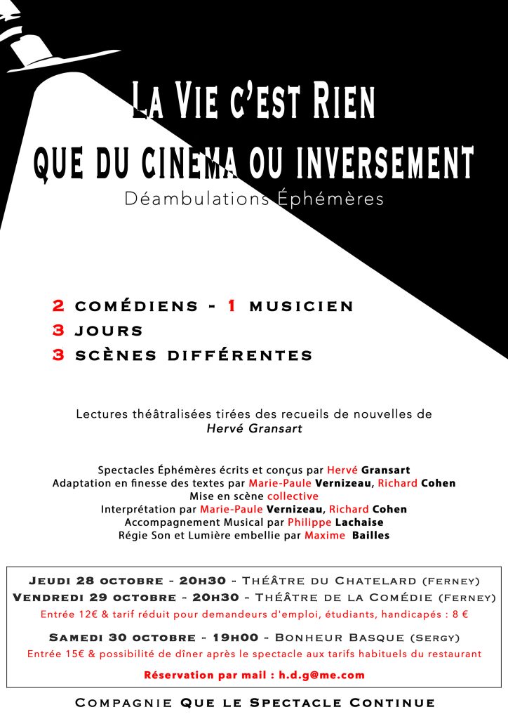 C’est une lecture théâtralisée issue de trois recueils de nouvelles écrites et publiées au fil des années qui sont proposées pour ce spectacle intitulé « La vie c’est rien que du cinéma ou inversement – déambulations éphémères ».