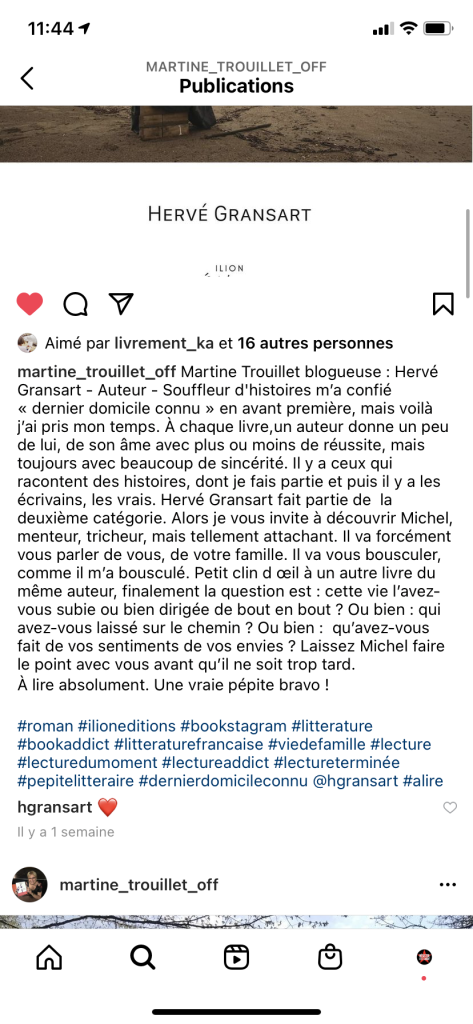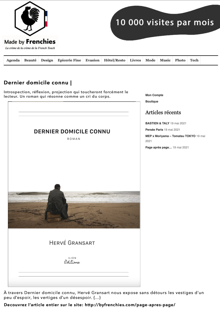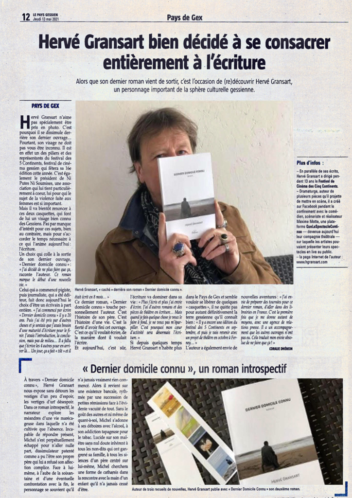« Dernier domicile connu » est le premier livre que je lis d’Hervé Gransart. Je ne peux m’empêcher de me dire qu’une part de l’auteur est dans ces pages….