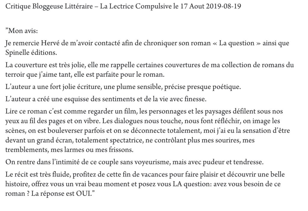 « Je connaissais déjà cet auteur, son univers et son style à travers notamment « La question ».