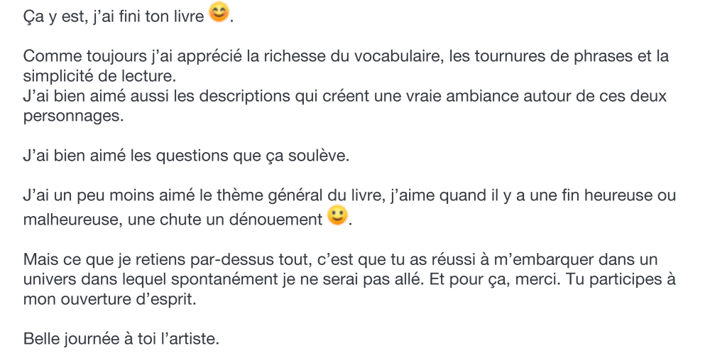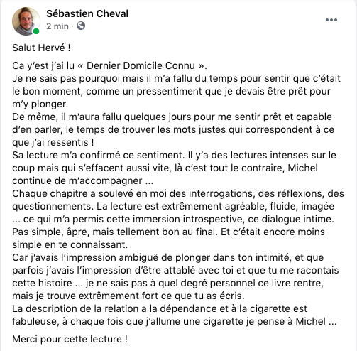 Mais je vous rassure ce n’est absolument un livre sombre non, n’interprétez pas mal mes propos, c’est un livre puissant jusqu’à la dernière page, parce que l’histoire de Michel est tellement « folle » et que l’auteur a mis tellement de lui que le « Dernier Domicile Connu » est vraiment le livre qui m’a le plus marqué depuis bien longtemps et très curieusement depuis cette lecture dans certaines occasions je vois Michel, et je l’entends comme une petite voix bienveillante, avec son expérience de vie, sa vie cabossée, « Es-tu sûre de toi, est-ce que c’est vraiment ça que tu veux ? »