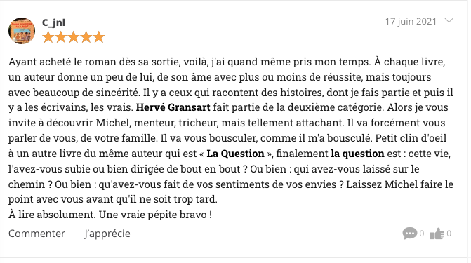 Au travers des virages, des routes sinueuses , et des allers-retours de l’âme de Michel nous découvrons un monde que nous avons parfois exploré pour nous même . Relations aux autres, pudeurs des sentiments, addictions destructrices….j’ai détesté Michel tout en m’attachant à lui.