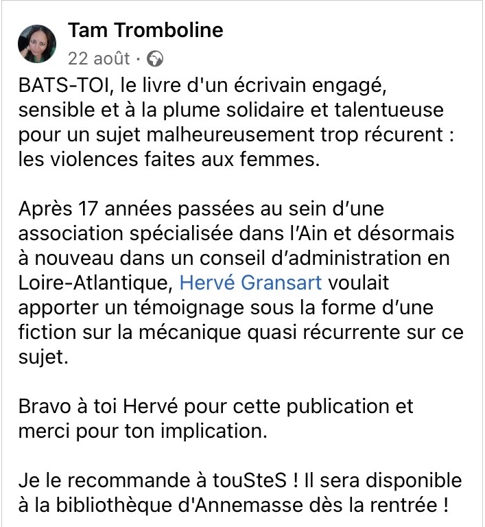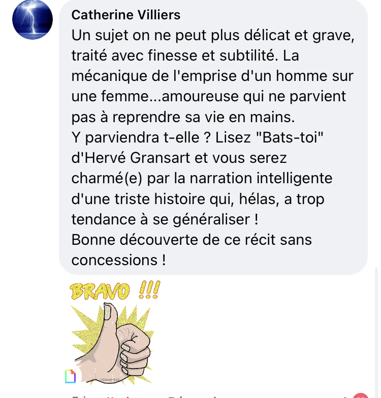 « Bats-toi » est un témoignage voulu aux femmes victimes de violences intrafamiliales. Sans larmoiement, sans lamentation. Une histoire compilant la somme d’avanies vécues.